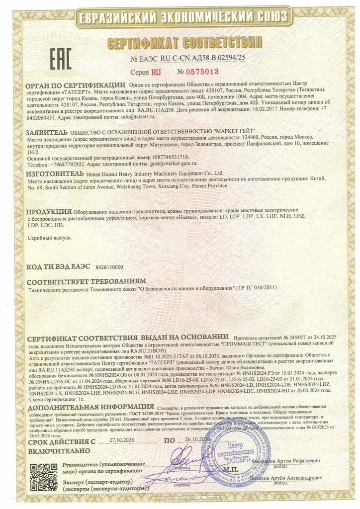 В 2025 году компания Huasui Heavy Industry Machinery Equipment Co., Ltd (HNHS) добилась нового значимого успеха в области международной сертификации: мостовые краны успешно прошли аудит EAC и получили официальное разрешение на поставки в Россию, Казахстан, Беларусь, Армению и Кыргызстан. Этот результат подтверждает, что качество продукции и система производства HNHS соответствуют самым строгим техническим требованиям Евразийского региона. Он также свидетельствует о новом этапе в стратегии глобализации и расширении присутствия компании на международных рынках.