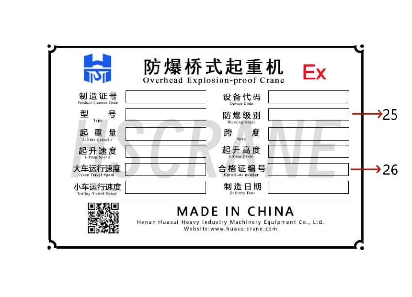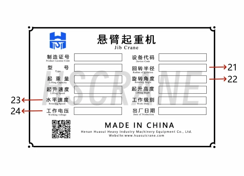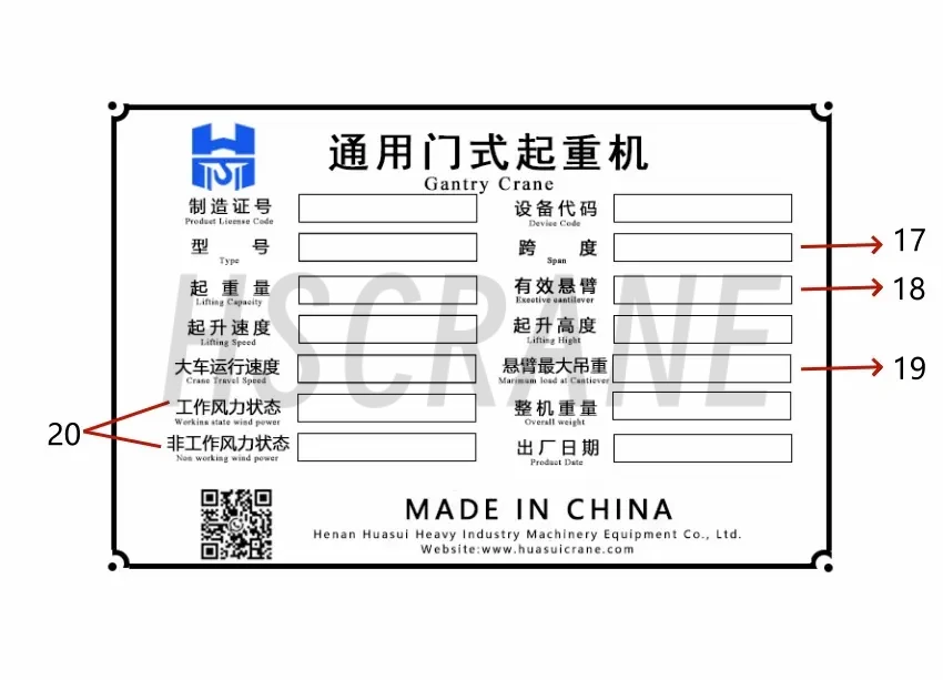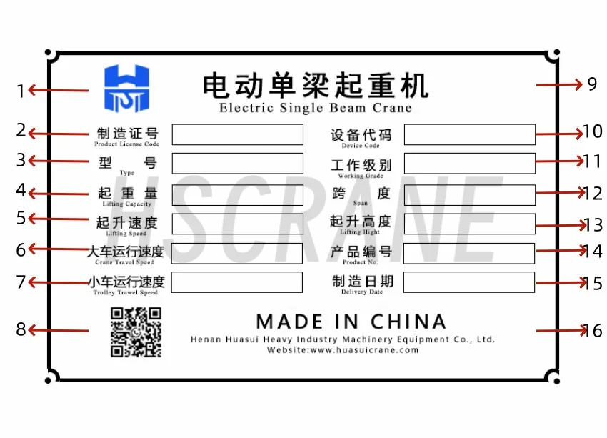 Пояснение: Разные типы кранов (LD, LH, QD и др.) имеют существенные различия в параметрах, указанных на табличке. Игнорирование этих данных может привести к ошибке в подборе оборудования или несовместимости запасных частей. Профессиональные производители, например HSCRANE, используют номер таблички для подбора точной технической документации.