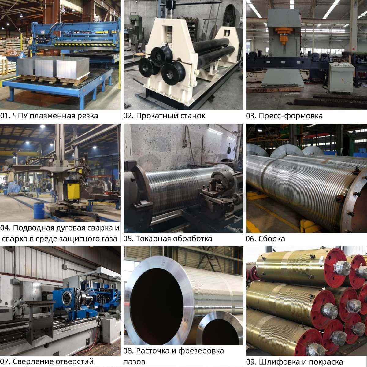 Ключевые моменты производства: обработка барабана включает сварку и токарную обработку. Сварка обеспечивает качество шва, прочность и жёсткость; после сварки проводится дефектоскопия UT/MT. Токарная обработка гарантирует соответствие размеров и допусков проектным требованиям.