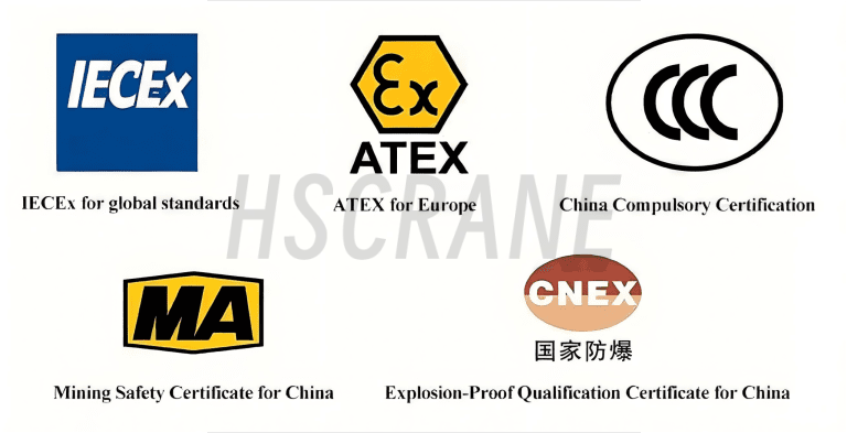 Взрывозащищённая электрическая таль с канатным подъёмом HSCRANE имеет следующие сертификаты: IECEx (соответствие глобальным стандартам), ATEX (для Европы), CCC, Сертификат безопасности для горнодобывающей промышленности и Сертификат квалификации взрывозащиты (для Китая).