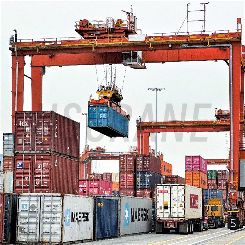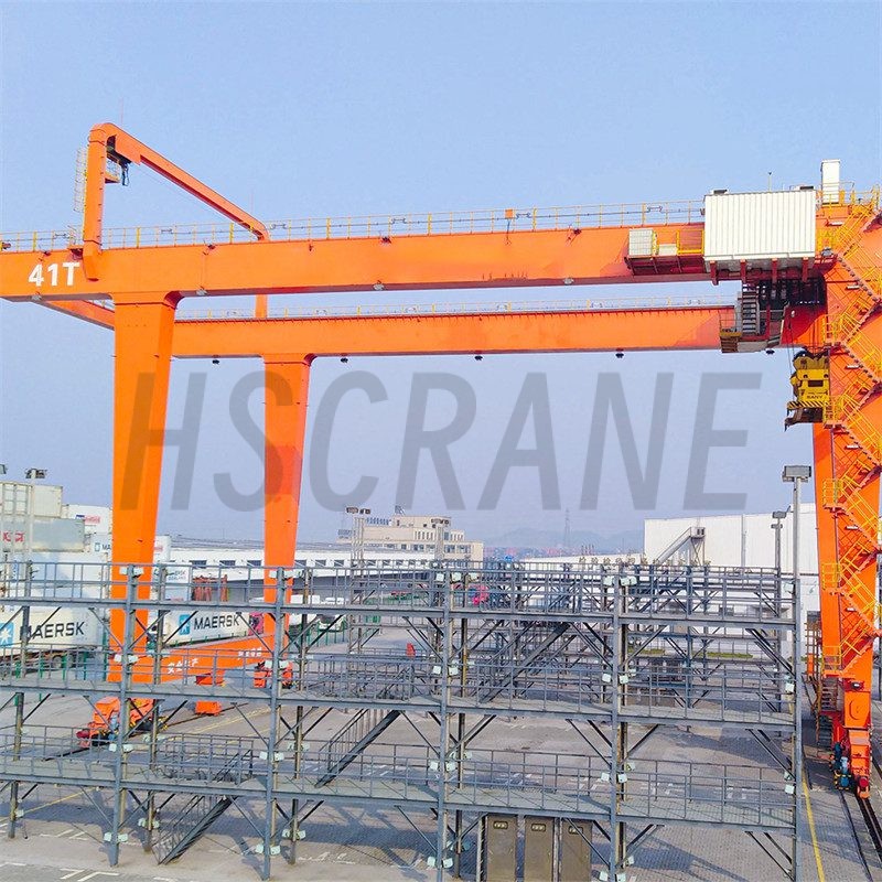 Козловой кран с рельсовым креплением для контейнеров (RMG) предназначен для работы с ISO-стандартными и железнодорожными контейнерами. Он широко используется на портовых терминалах, железнодорожных станциях и в логистических хабах. Этот кран функционирует на рельсах с многоколесными стальными тележками и питается от электросети.