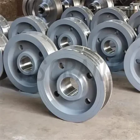 Фланцевые колёса для подъёмной техники: однобортные, двухбортные, безбортовые и нестандартные. Изготовлены из легированной стали (4140, SCM440, 42CrMo и др.) методом ковки или литья, с точной токарной обработкой, закалкой и отпуском.