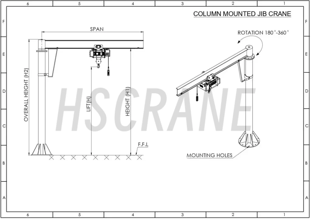 • Модульный дизайн: индивидуальный подбор длины стрелы (2–8 м), грузоподъёмности (0,25–5 т) и высоты колонны.