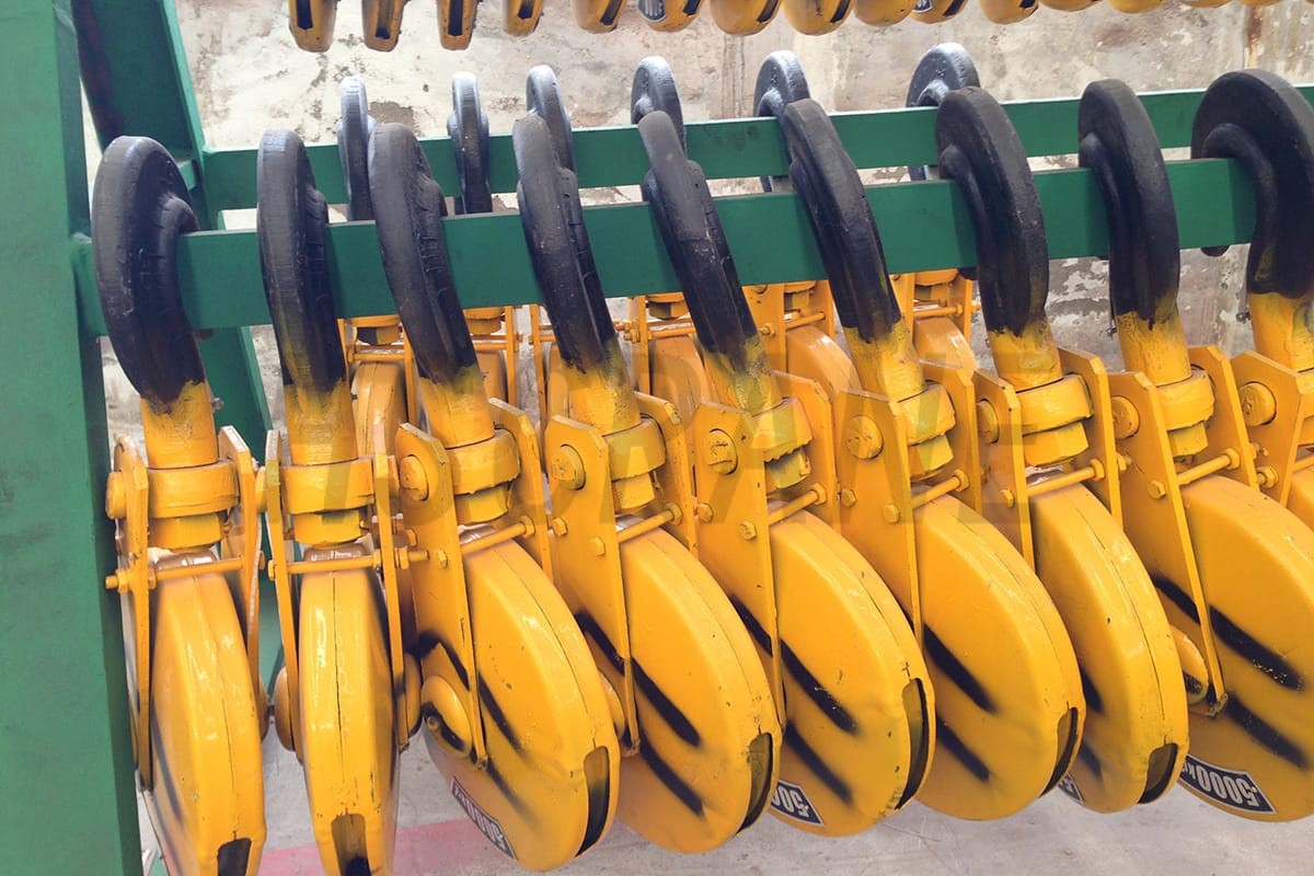 Крюк кован из высокопрочной углеродистой стали, такой как DG20, с коэффициентом безопасности > 5. Для грузов от 0,5 до 5 тонн используется крюк с одним блочным устройством, а для грузов от 10 тонн и выше — с двумя блочными устройствами. Поверхность крюка гладкая, без дефектов, таких как трещины, складки или перегрев. Кроме того, отсутствуют внутренние дефекты, такие как трещины, белые пятна и другие включения, которые могут повлиять на безопасность эксплуатации. Кроме того, крюк оснащен защитным замком от расцепления для предотвращения соскальзывания каната и возможностью свободного вращения на 360°.
